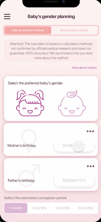 The blood renews each 3 years for women and 4 yeards for men. If woman's cycle was earlier the baby's gender will be female, If man's cycle was earlier the baby's gender will be male. In this case the Rhesus factor is very important. If mother has a negative Rhesus factor, the baby's gender will depends on the fact who has the stagnater blood.